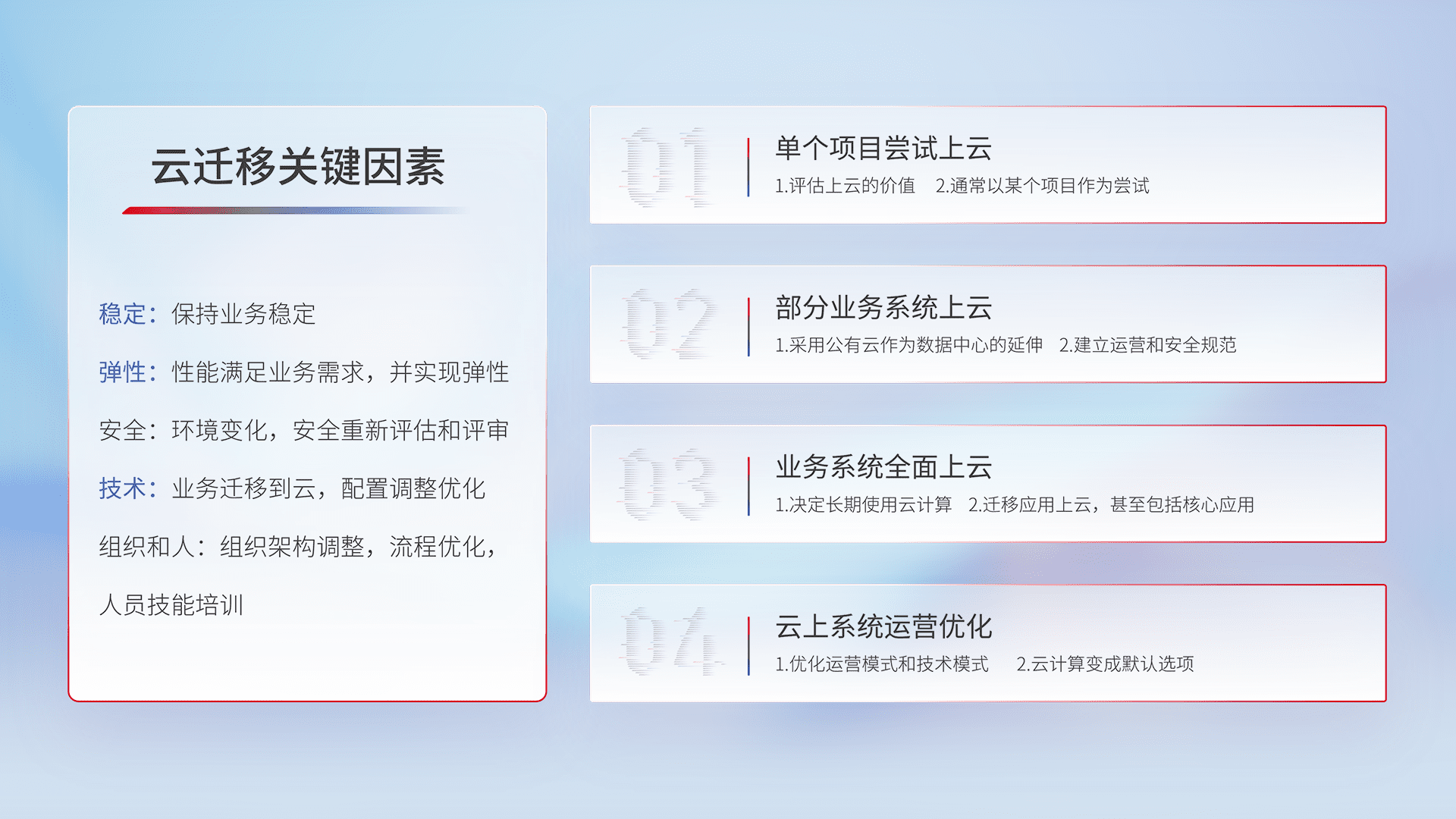 结合实际业务,,从规划设计、、云平台选型、、、云原生改造、、、数据迁移、、集成交付,,,,迁移全过程为客户识别最佳上云路径,,,做好风险识别管理,,,,设计网络架构、、、身份权限、、、安全审计合规、、操作审计、、、、日志审计、、监控告警策略、、、多站点容灾设计等,,,,对云上基础设施进行整体规划,,,提升IT治理水平,,,以满足弹性、、、高可用、、、、高性能的需求。。。