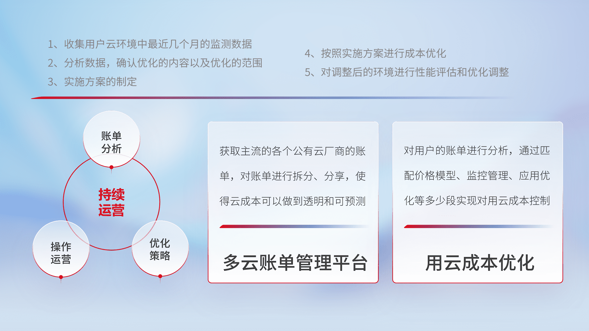 通过多云纳管,,以统一的资源数据模型把客户的云资源进行抽象和封装,,,进而实现对多云资源的统一操作,,,,保障云资源管理的可靠性、、、、稳定性与可用性。。。量身定制化运维内容,,配置、、开发运维、、、补丁管理、、、备份、、、、监控、、、、认证和访问管理、、、审计和日常巡检等,,,保障在用云过程中的可靠度,,,稳定度以及高可用率。。